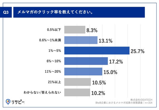 「Q3.メルマガのクリック率を教えてください。」(n=314)と質問したところ、「1%~5%」が25.7%、「6%~10%」が17.2%、「11%~20%」が15.0%という回答となりました。