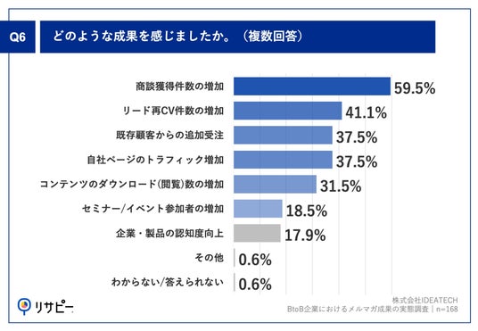 Q5で「かなり成果を感じている」「やや成果を感じている」と回答した方に、「Q6.どのような成果を感じましたか。(複数回答)」(n=168)と質問したところ、「商談獲得件数の増加」が59.5%、「リード再CV件数の増加」が41.1%という回答となりました。