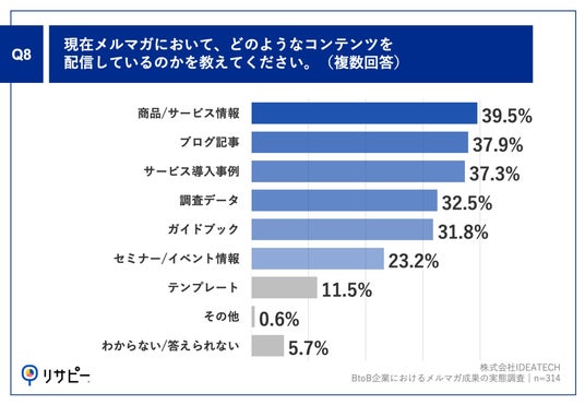 「Q8.現在メルマガにおいて、どのようなコンテンツを配信しているのかを教えてください。(複数回答)」(n=314)と質問したところ、「商品/サービス情報」が39.5%、「ブログ記事」が37.9%、「サービス導入事例」が37.3%という回答となりました。