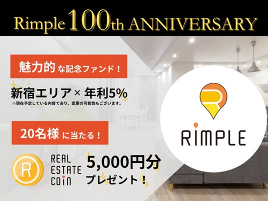 また、皆様に新しい「投資の形」の一つに不動産型クラウドファンディングがあることを知ってもらうため、今回は「Rimple's Selection #100 記念キャンペーン」として、新規に「Rimple」への会員登録とファンドへの応募が完了した方に抽選でリアルエステートコインが20名様に当たるキャンペーンを開催いたします。