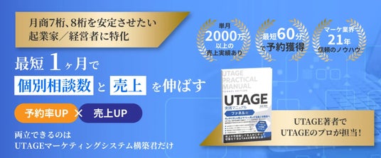 当サービスを担当するのは「UTAGE実践マニュアルファネル編」の著者でもある徳武輝彦。マーケティング業界21年、単月2,000万円以上の売上実績のあるUTAGEのプロが、個別相談数や売上アップに向けてサポートします。