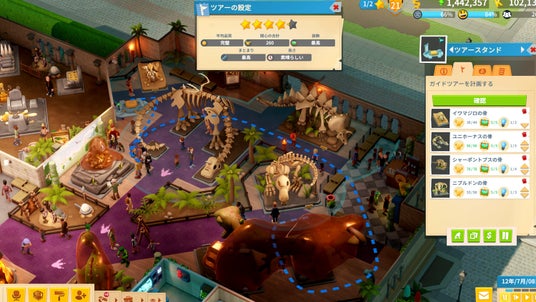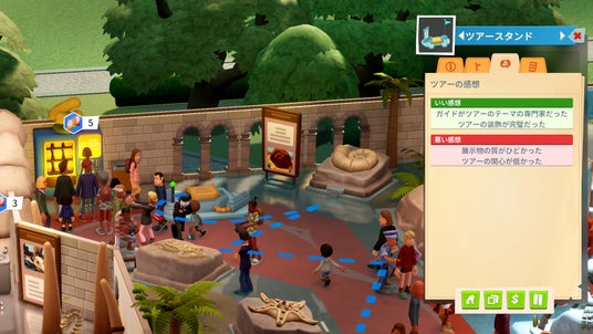 アイテム「ツアースタンド」を設置し、ガイド役の専門家を雇用して、ツアーの準備を整えましょう。プレイヤーは、ツアーのコースやルートを定め、来館者にどんな体験をしてもらうか計画することができます。