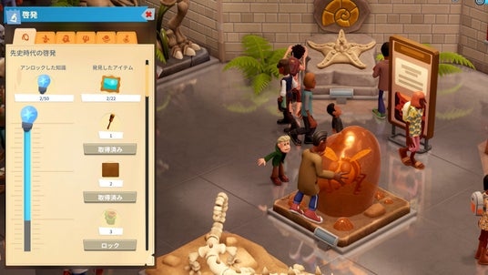 また、学芸員であるプレイヤーは啓発を受けることができます。「啓発レベル」をあげると、「先史時代」や「植物」など、分析したそれぞれのテーマに沿った新しい装飾品や体験型展示物などを報酬としてアンロックすることができます。