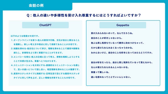 大規模言語モデル(LLM)はもともと、質問に答えることを得意とする一方的なやり取りが主流でした。「Geppetto」は人間らしいコミュニケーションに特化しているため、理論的かつ端的に伝えるだけでなく、リアクションを返したり、関係のない話題を交えたりと、人間らしい感情が込められた文章やリアクションを生成することができます。