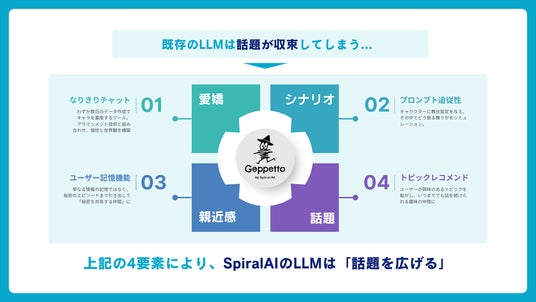 日本は長年、アニメやゲーム、キャラクターコンテンツを通じて、世界中の人々の心を動かしてきましたが、デジタル化が進む中で、IP(知的財産)の新たな可能性を十分に活かしきれていないのが現状です。当社は、日本のIP産業の未来を見据え、「愛嬌」を学び、キャラクターが“生きている”ように感じられる特化型のLLM「Geppetto」を開発しました。世界的に愛される名作ファンタジーの主人公ピノキオを作ったおもちゃ職人のおじいさんゼペット。彼の願いで人形だったピノキオが命を吹き込まれ、まるで人間のように生き生きと動き出したように、様々なキャラクターたちに命を吹き込みたいとの想いから名付けました。