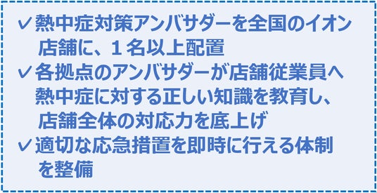 イオングループ全店長を中心に約1万3,000人に「熱中症対策アンバサダー(R)資格」取得を推進し、熱中症に対する正しい知識を身につけ、「お客さまへの熱中症対策アドバイス」や「安全に夏を過ごす知識」の提供を行います。