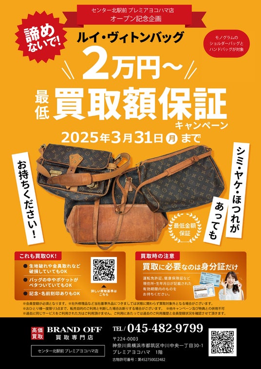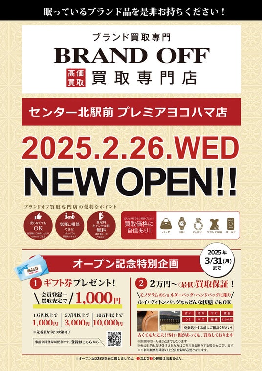 「ブランド買取専門店 BRAND OFF センター北駅前 プレミアヨコハマ店」が神奈川県横浜市に2月26日(水)オープン