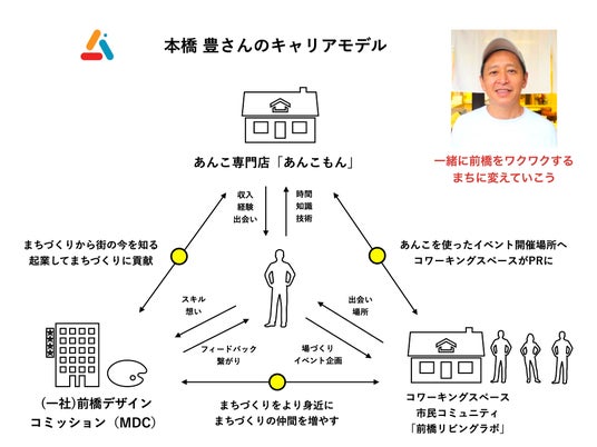前橋中心市街地の弁天通り商店街であんこ専門店「あんこもん」を営む本橋豊さんは下記のようなキャリアモデルで活躍されています。本橋さんのキャリアの特徴は、前橋のまちづくりと密接につながっていることです。「あんこもん」を営む傍ら、コワーキングスペース「前橋リビングラボ」を運営し、前橋デザインコミッション(MDC)にも参画するなど、前橋のまちづくりにも携わっています。このように、本橋さんならではのオンリーワンのキャリアモデルであり、それぞれの活動同士が相乗効果、創発効果を生み出しています。