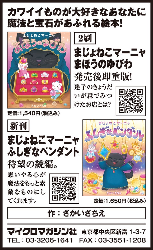 マイクロマガジン社(東京都中央区)は、絵本『まじょねこマーニャ まほうのゆびわ』『まじょねこマーニャ ふしぎなペンダント』の広告を2月19日(水)の朝日新聞に掲載いたしました。