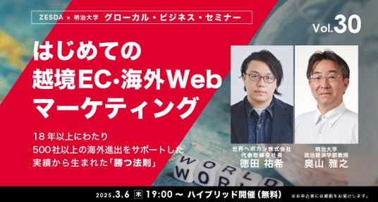 特定非営利活動法人ZESDA(代表理事:桜庭大輔、所在地:東京都中央区、以下NPO法人ZESDA)は、2025年3月6日(木)にグローカル・ビジネス・セミナーvol.30をハイブリッド開催します。今回は、世界へボカン株式会社 代表取締役の徳田 祐希(とくだ ゆうき)さんをお迎えし、『はじめての越境EC・海外Webマーケティング』というテーマでお話しいただきます。