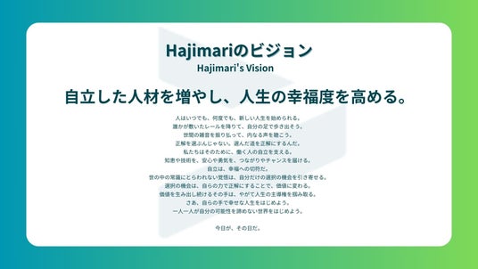 そこで、自らの道を自ら選び、その道を正解とする人生を歩むことを決意したことで、人生が好転し始めました。この経験をもとに「すべての人が自ら選んだ人生を正解にできる」と確信し、「自立した人材を増やし、人生の幸福度を高める」というHajimariのビジョンが誕生いたしました。