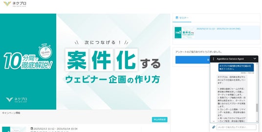 また、ウェビナーや動画の視聴画面にAgentforceのチャットを設置することで、これまで有人でのサポートが必要であったチャット対応を自動化、待ち時間0での回答により顧客の体験価値を向上させることができます。