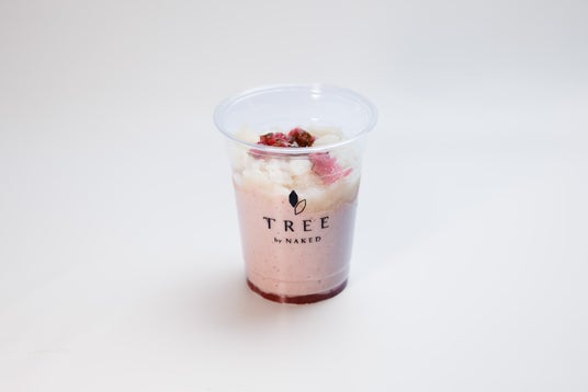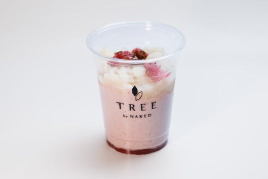 代々木公園店の系列店「TREE by NAKED meiji park」でも期間限定で販売する「桜甘酒マーブルスムージー」(税込1,000円)。いちごシロップの上に、自家製の桜花シロップと豆乳を使った桜色のスムージーを重ね、甘酒シャーベットをトッピングしました。