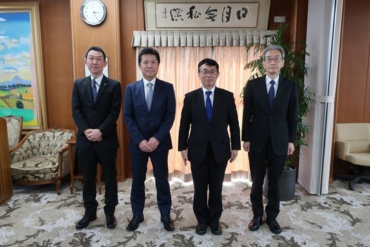 図3 本学来学時の様子(左から、JVCケンウッド 未来創造研究所所長 神宮司秀樹、JVCケンウッド 取締役 常務執行役員 最高技術責任者(CTO)園田 剛男、佐賀大学 教授 嘉数 誠、佐賀大学 学長 兒玉 浩明)