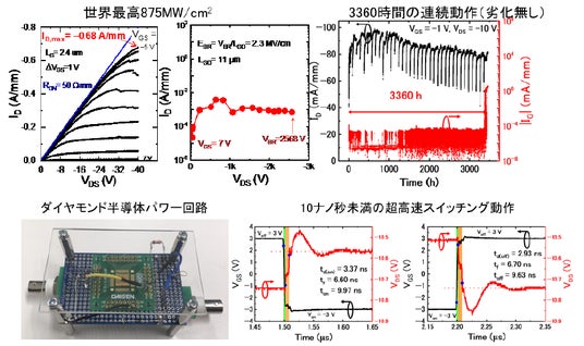ダイヤモンド半導体は、現在幅広く使われているシリコン半導体より、約5倍のバンドギャップエネルギーをもつため、ダイヤモンド半導体が実用化できれば、約50,000倍の高出力電力・高効率のパワー半導体にすることができます。その他に、ダイヤモンド半導体は、宇宙通信用の半導体、量子コンピュータの記憶素子の応用も検討されています。佐賀大学は、ダイヤモンドで半導体の独自のドーピング技術を保有していることから、世界の先端を行く、875MW/cm2の出力電力などの成果を継続的に発表しています。