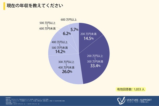 「現在の年収を教えてください」と質問したところ、「200万円未満(14.5%)」「200万円以上~300万円未満(33.4%)」「300万円以上~400万円未満(26.0%)」「400万円以上~500万円未満(14.2%)」「500万円以上~600万円未満(6.2%)」「600万円以上(5.6%)」という回答結果となった。