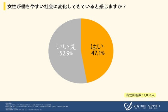 「女性が働きやすい社会に変化してきていると感じますか?」と質問したところ、「はい(47.1%)」「いいえ(52.9%)」という回答結果となった。