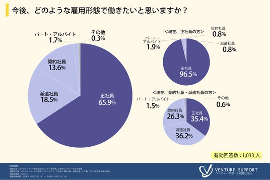 「今後、どのような雇用形態で働きたいと思いますか?」と質問したところ、「正社員(65.9%)」「派遣社員(18.5%)」「契約社員(13.6%)」「パート・アルバイト(1.7%)」「その他(0.3%)」という回答結果となった。