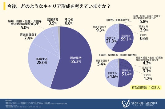 「今後、どのようなキャリア形成を考えていますか?」と質問したところ、「現状維持(55.3%)」と回答した人が最も多く、次いで「転職する(28.0%)」「昇進を目指す(7.4%)」「結婚・妊娠・出産・介護を機に勤務時間を減らす(5.0%)」「起業する(3.5%)」「その他(0.8%)」と続いた。