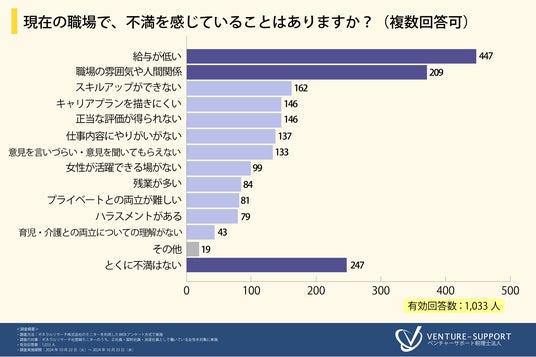 「現在の職場で、不満を感じていることはありますか?(複数選択可)」と質問したところ、「給与が低い(43.3%)」と回答した人が最も多く、次いで「職場の雰囲気や人間関係(20.2%)」「スキルアップができない(15.7%)」「キャリアプランを描きにくい(14.1%)」「正当な評価が得られない(14.1%)」「仕事内容にやりがいがない(13.3%)」「意見を言いづらい・意見を聞いてもらえない(12.9%)」「女性が活躍できる場がない(9.6%)」「残業が多い(8.1%)」「プライベートとの両立が難しい(7.8%)」「ハラスメントがある(7.7%)」「育児・介護との両立についての理解がない(4.2%)」「その他(1.8%)」と続いた。「とくに不満はない」と回答した人は、23.9%であった。