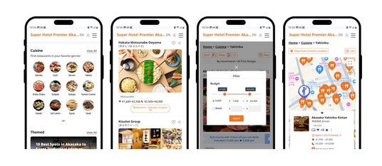 インバウンド旅行者に必要な母国語でのレストラン名検索に加え、料理ジャンル、予算、サービス条件(喫煙可否、クレジットカード対応、子供同伴可否) などの検索機能を提供します。さらに、ホテルからの半径距離や旅行者の現在地を基準とした地図検索も可能です。