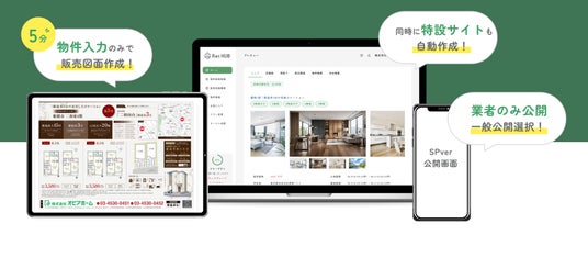 物件情報を入力するだけで、これまで外注に頼っていた販売図面や物件特設サイトの作成を、たった5分で作成できる画期的なサービスです。また、土日祝日、外注先の定休日を気にすることなく、いつでも即座に作成できるため、タイムラグのない物件公開が可能。スピードが求められる現場でご活用いただけます。
