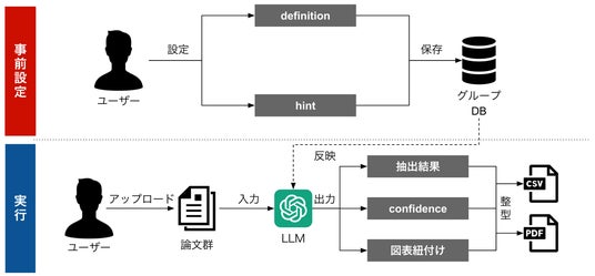 そのため研究案件ごとにグループを作成し、各抽出項目ごとに定義と抽出のヒントを設定します。一からユーザーが定義等を設定することは負荷が大きいため、LLMで各定義のたたき台を作成しそれをベースにユーザー側で細かい修正を行います。