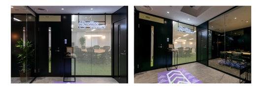 エントランスは、天吊りのロゴサインと人を感知して動く床のマッピングで、ご来客の皆様にインパクトを与える設計に仕上げました。また、ガラス張りの仕様にすることで、お越しくださる方々に圧迫感を与えずオフィスの内を見渡しやすくしています。