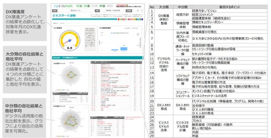 成果を可視化するためのスコア測定は、「きづなPARKプラットフォーム」の『DXスタート診断』を活用しました。この診断は、経済産業省のDX推進指標をベースに、分かりやすく整理した29項目の質問から成り立っています。具体的には「DX推進体制」「デジタル化・デジタル技術の活用」「DX人材の育成」「ビジネスモデル」の4つの観点で企業の状況を診断し、自社の状況を同業他社平均と比較したチャートとして表示。これにより、各企業が強みや改善すべきポイントを把握しやすくなります。今回の伴走支援では、支援開始前と支援経過時にこの診断を行い、支援による効果を定量的に測定しました。