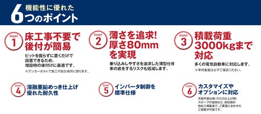 床置き型のターンテーブルは、ピットと呼ばれる地下空間を掘る工事が不要であるため、設置費用を抑えられます。また、ピットに装置を埋め込む埋込型のターンテーブルと比較して、床置き型のターンテーブルは、回転させるためのローラー等の厚みによってどうしても高さがでてしまい、乗り入れが難しいという声がありました。そのような課題を解決するために改良を重ね、他社にはない厚さ80mmでありながら、電気自動車も乗り入れ可能な積載荷重3000kgを実現しました。