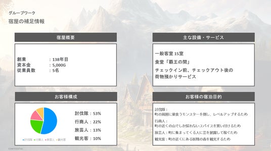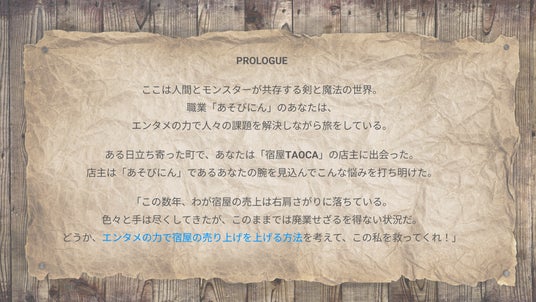 応募者がRPG(ロールプレイングゲーム)の世界に没入し、困っている宿屋の店主の課題解決をするというストーリーを通じて、実業務に近い体験を行うグループワークを実施しました。応募者はゲームの世界観を楽しみながら、ゲーミフィケーションによる課題解決を行う中で、問題解決能力やチームワーク(立ち位置)などを選考官が注視しながら選考を進めました。