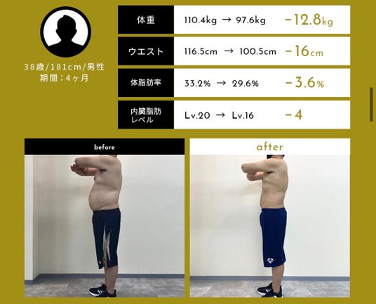 その結果、体重は-12.8kg、数値面も全て標準まで改善されました。