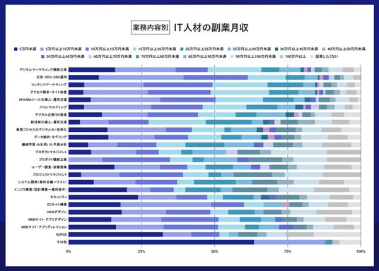 副業内容別で見てみると、副業で月30万円以上を稼いでいるIT人材が携わっているのは、1位「プロダクトマネジメント」(46.0%)、2位「プロジェクトマネジメント」(43.3%)、3位「プロダクト戦略立案」(42.1%)、4位「インフラ構築(設計構築~運用保守)」(40%)、5位「ユーザー調査・改善提案」(34.3%)となり、デジタルマーケターやシステムエンジニアよりも、PdMやインフラエンジニアの副業月収が高い傾向となっています。