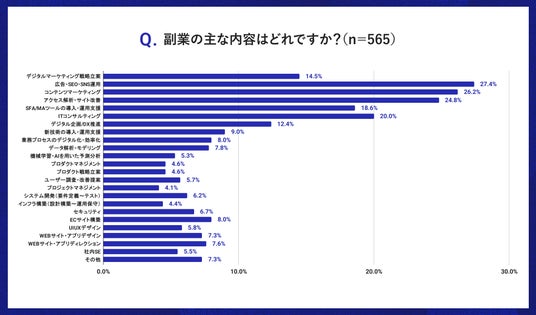 副業経験のあるIT人材に、主な副業内容について尋ねたところ、1位は「広告・SEO・SNS運用」(27.4%)、2位は「コンテンツマーケティング」(26.2%)、3位は「アクセス解析・サイト改善」(24.8%)となり、副業ではデジタルマーケティングに関連する業務に携わるIT人材が多いという結果になりました。