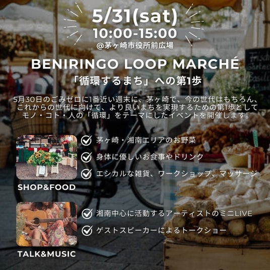 このビジョン達成に向けた第一歩として開催するのが、今回の「BENIRINGO LOOP MARCHE」。マルシェ当日は茅ヶ崎の農産物やそれらを使用したフード&ドリンク、アップサイクルやリサイクルなど環境に配慮した商品、資源循環に関するサービスに触れ、ワークショップにて体感し、トークを通して考える機会を提供します。
