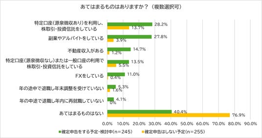続いて、確定申告をする予定・検討中、しない予定の人それぞれに「あてはまるものはあるか?」聞きました。ともに「あてはまるものはない」(する予定・検討中:40.4%、しない予定:76.9%)が最多でしたが、する予定・検討中の人の3割弱が「特定口座(源泉徴収あり)を利用し、株取引・投資信託をしている」(する予定・検討中:28.2%、しない予定:13.7%)、「副業やアルバイトをしている」(する予定・検討中:27.8%、しない予定:3.9%)と答えました。