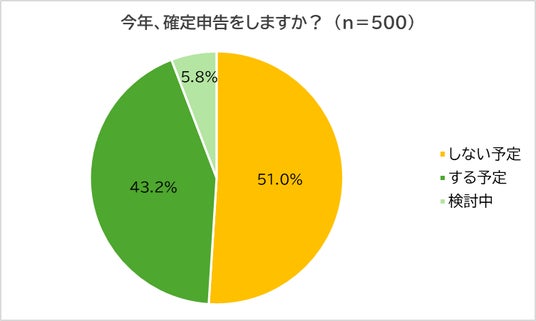 国税庁によると、令和5年分の所得税等の確定申告書の申告人員は 2,324 万人、令和6年分も全国で2,000万人を超える納税者が確定申告をするとしています。そこで、どれくらいの割合の人が「確定申告をするのか?」聞いたところ、「する予定」(43.2%)、「検討中」(5.8% )、「しない予定」(51.0%)となりました。