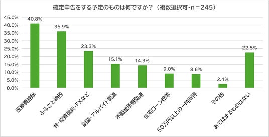 確定申告をする予定・検討中の人に「確定申告をする予定のものは何か?」聞いたところ、最多は「医療費控除」(40.8%)、次いで「ふるさと納税」(35.9%)、「株・投資信託・FXなど」(23.3%)、「副業・アルバイト関連」(15.1%)、「不動産所得関連」(14.3%)となりました。