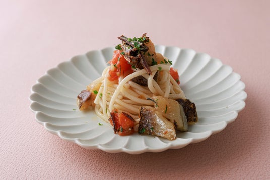 飛魚とトマトに「燻いりこサクっ!」をまぶしたパスタです。麺には長崎県の五島手延べうどん(犬塚製麺所)を使用。いりこの食感をアクセントに、飛魚の旨みがトマトやオリーブオイルとマッチした一品です。