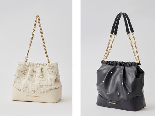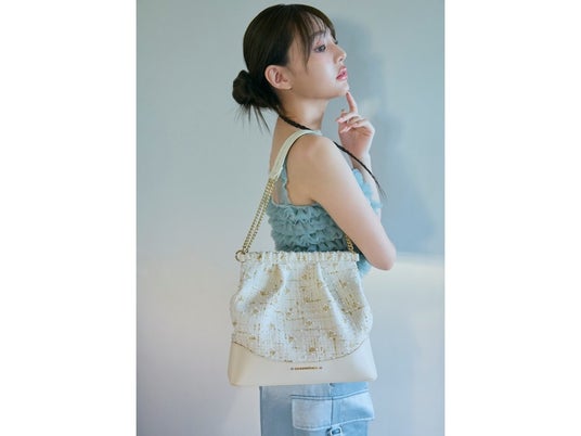 トレンド感溢れるサマーツイードの巾着バッグ。キラキラとした素材にパールを施し