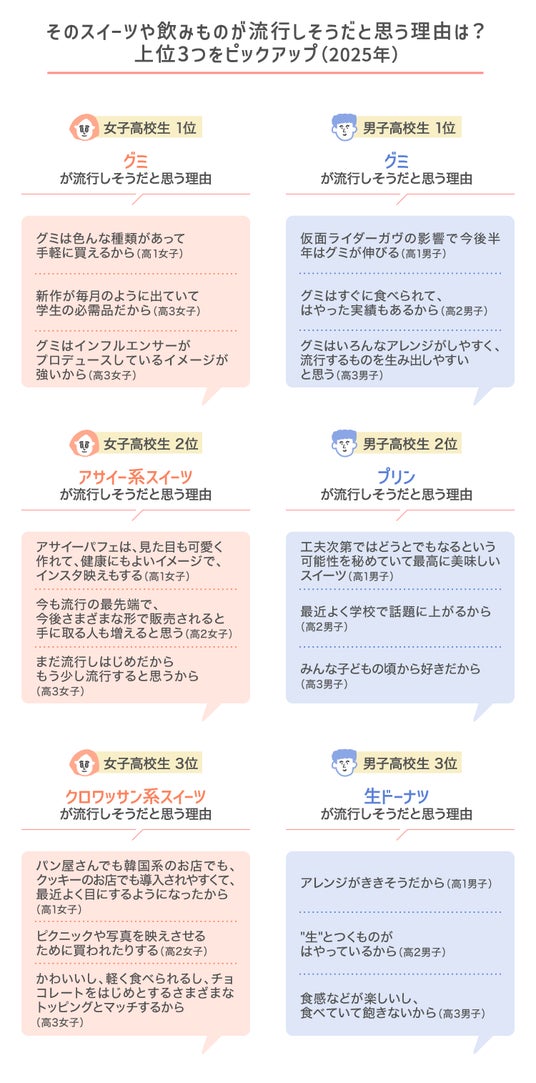 高校生に、これから流行しそうだと思う「スイーツ」や「飲みもの」について聞きました(2025年3月時点)。