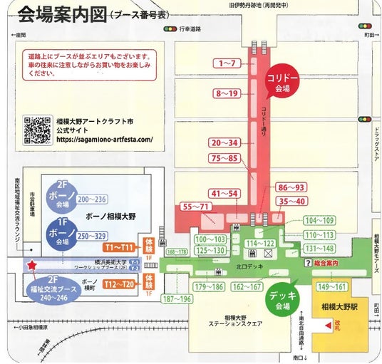 全国に数あるアートクラフト市の中でも特筆すべきはその立地と規模です。小田急線のターミナル駅「相模大野駅」北口駅前のペデストリアンデッキ・プロムナード・ショッピングモールを広域にわたり活用。多彩なアートクラフトのブースが並ぶ駅前会場には、毎年市内外から多くの人が訪れます。