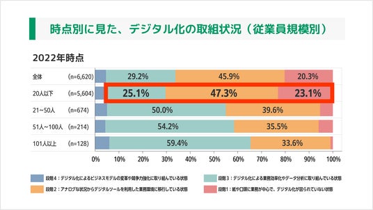 また、経済産業省 中小企業庁が公表した「2023年版 小規模企業白書」(※)では、従業員20人以下の小規模事業者の70.4%が、紙や口頭での運用を含むデジタル化の初期段階(段階1~2)にとどまっていると報告されています。