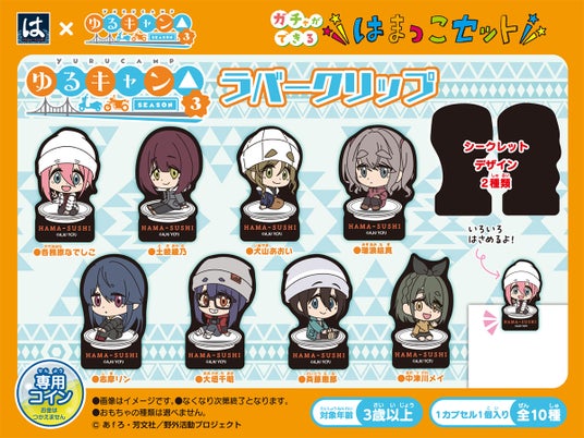 株式会社はま寿司(代表取締役社長:町野 岳 本社:東京都港区)が展開する100円寿司チェーン「はま寿司」でお楽しみいただける、ガチャコイン付き「はまっこセット(全4種)」のおもちゃに、4月26日(土)より、全国の店舗にて、『ゆるキャン△ SEASON3 ラバークリップ』が登場します。