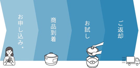 商品を購入することなく、使い勝手などを直接お試しいただけるサービスです。じっくりお試しいただける「月額制プラン」と、気軽にお試しいただける「ワンタイムプラン」からお選びいただけます。気に入った商品は、そのままご購入いただくことも可能。また、レンタル終了時は返送を済ませるだけで手続きが完了します。