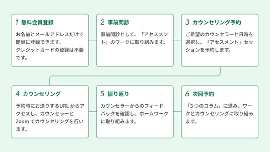 - カウンセリング:Zoomにて、カウンセラーと1対1のセッション(30分)を実施します