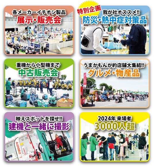 この展示会は、重機・電動工具・仮設資材など、70社を超えるメーカーが出展するほか、キッチンカーや物販ブースもあり、例年、大変活況となります。