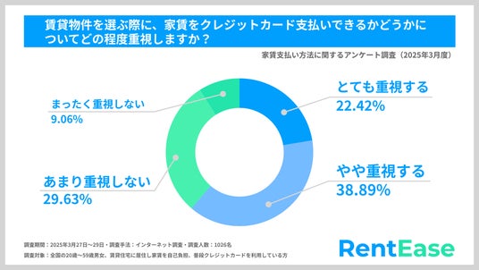 賃貸物件を選ぶ際に、家賃をクレジットカードで支払えるかどうかをどの程度重視するかという質問では、「とても重視する」(22.4%)、「やや重視する」(38.9%)を合わせると、実に61.3%もの人が重視していると回答しました。