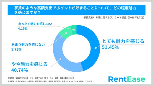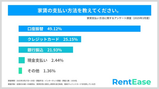 家賃のお支払いをクレジットカード払いに変更できるアプリ「RentEase」を提供するPropTech Japan株式会社(本社:東京都港区、取締役:伊藤 幹人)は、キャッシュレス決済が広く普及する現代において、家賃支払いに関する実態とニーズを探るべく、賃貸住宅に居住しご自身で家賃を支払っている全国の20歳~59歳の男女1026名を対象に、「家賃支払い方法に関するアンケート調査」を実施いたしました。