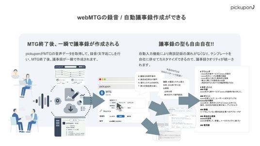 pickuponがMTGの音声データを取得して、録音/文字起こしを行い、MTG終了後、議事録が一瞬で作成されます。